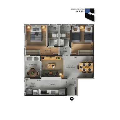 São 2 dormitórios, sendo 1 suíte, sala, cozinha estilo americana, 1 banheiro social, varanda gourmet, 1 vaga de garagem.